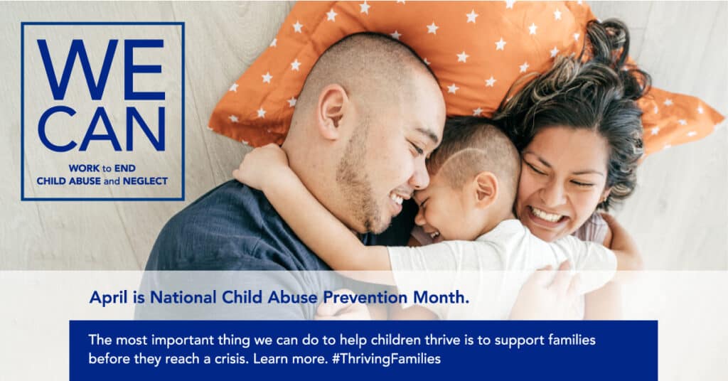 National Child Abuse Prevention Month recognizes the importance of families and communities working together to strengthen families to prevent child abuse and neglect. Through this collaboration, prevention services and supports help protect child and produce thriving families.