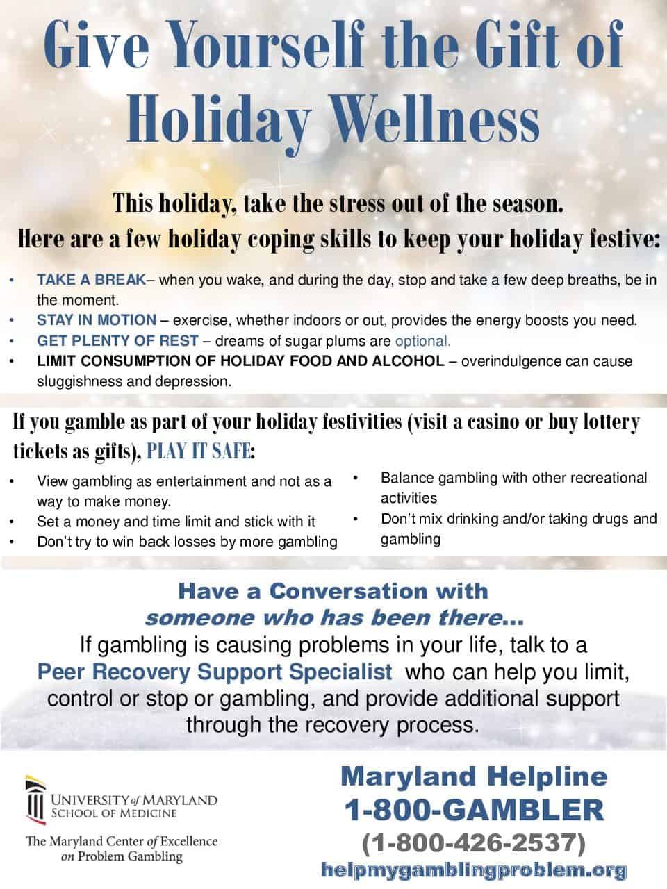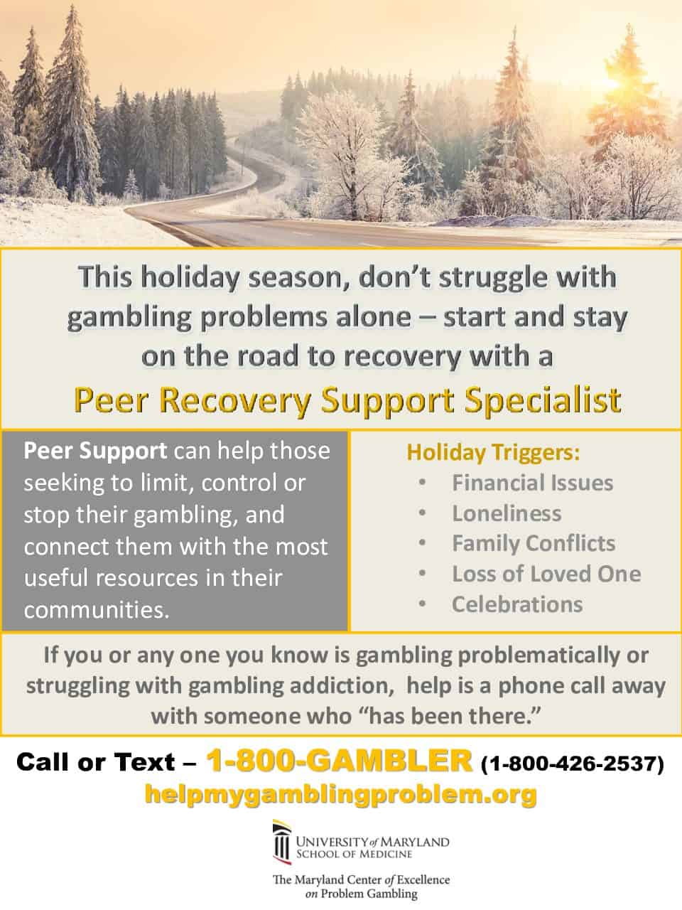If you, or any one you know, is struggling with problems due to gambling behavior, call 1-800-GAMBLER (1-800-426-2537) for assistance to resources on the road to recovery.